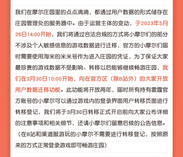 合作结束本就是开发方和代理方双方的事情,,,,降低这件事情对玩家的影响,,才是对所有珍视这段童年的摩尔玩家最好的呵护。。。。目前看来,,,用户完全不用担心后续因无法登录游戏而造成任何数据上的损失,,,只要及时进行账号转移,,,,就可以好好保留、、、延续在庄园的痕迹和回忆,,继续在庄园里做快乐的红鼻子小鼹鼠。。