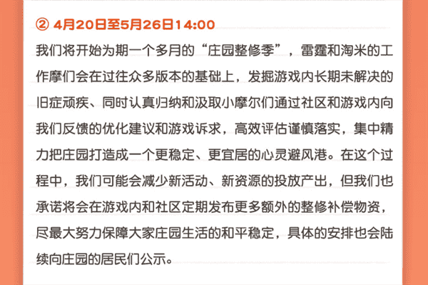 合作的结束并不意味着这个童年IP的结束,,对于《摩尔庄园》手游而言,,,,这是一个新阶段的开始。。。。后续游戏内将开启庄园重构计划,,会就以往遗留下来的BUG进行集中修复,,,并在游戏内和社区定期发布更多补偿物资。。。。
